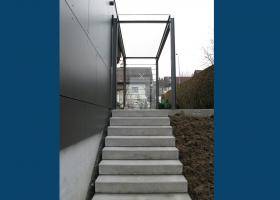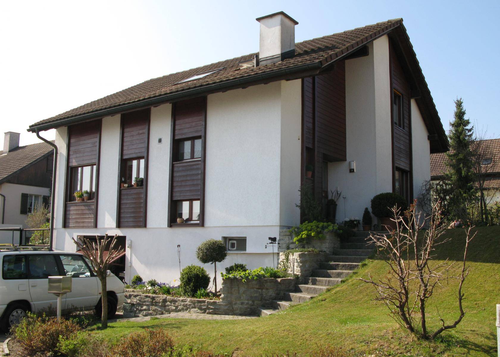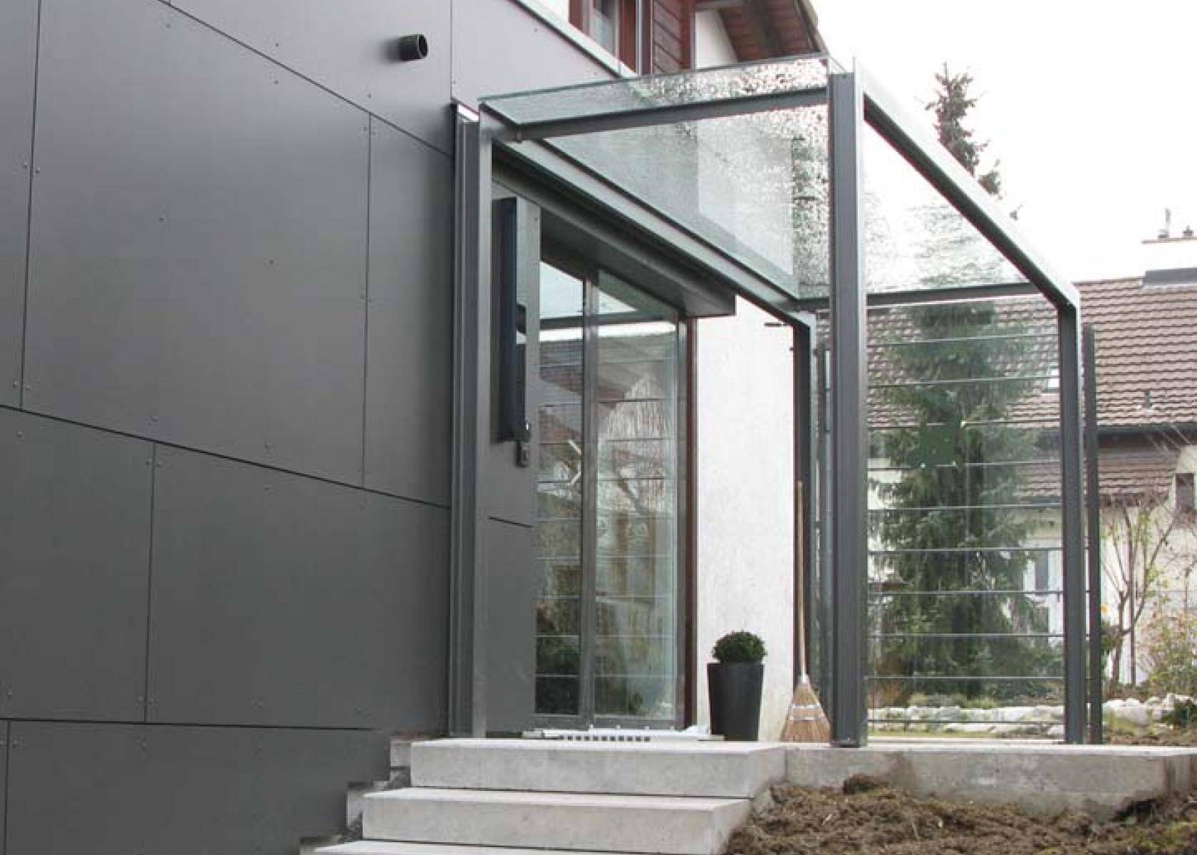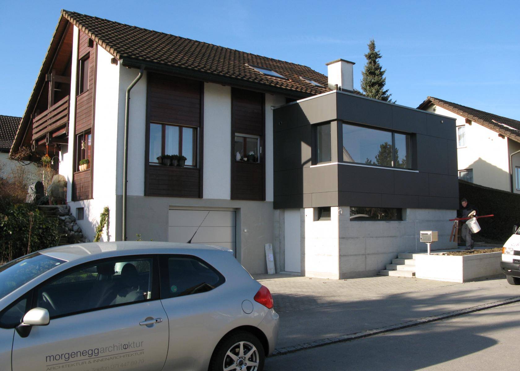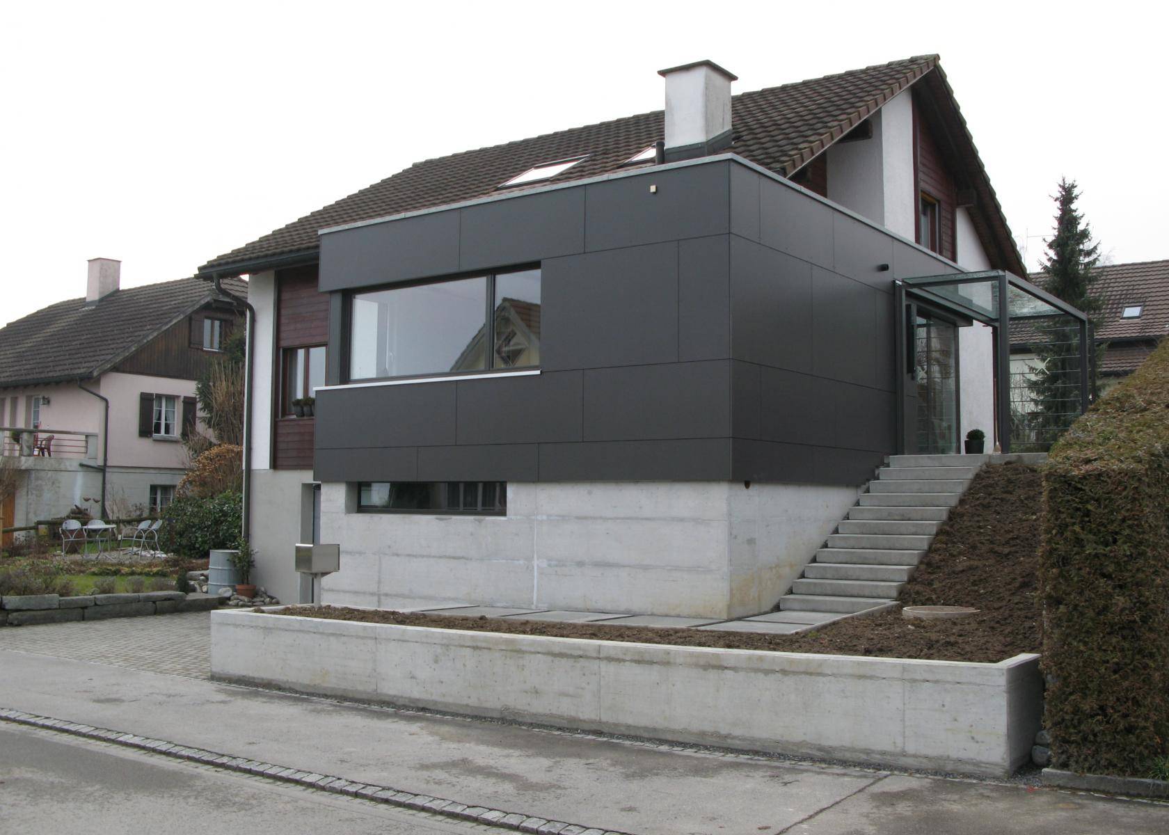 Der modern gestaltete zweigeschossige Anbau an das bestehende EFH ist gleichzeitig der neue Eingangsbereich des Gebäudes. Die klassische Architektur des Hauptgebäudes harmoniert in sehr guter Weise mit dem modern gestalteten Anbau.