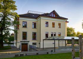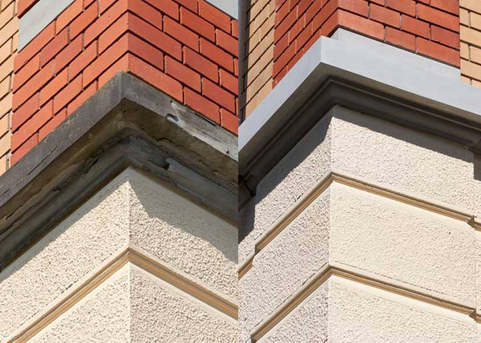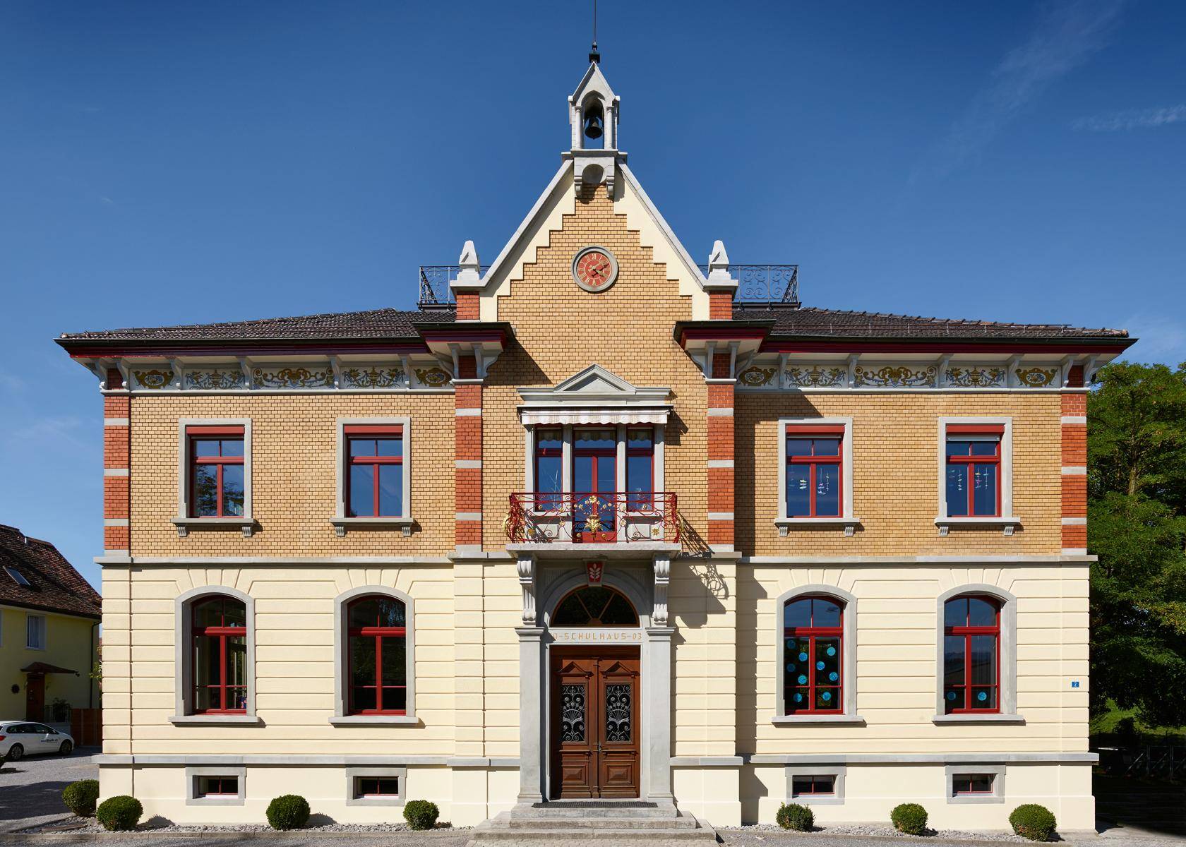 Zur Werterhaltung des denkmalgeschützten Schulhauses Stachen musste die Fassade teilsaniert werden. Die Restaurierung der verzierten Dachuntersichten sowie die Sanierung der Sandsteinarbeiten waren eine spezielle Herausforderung.